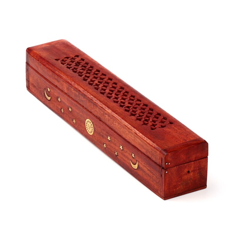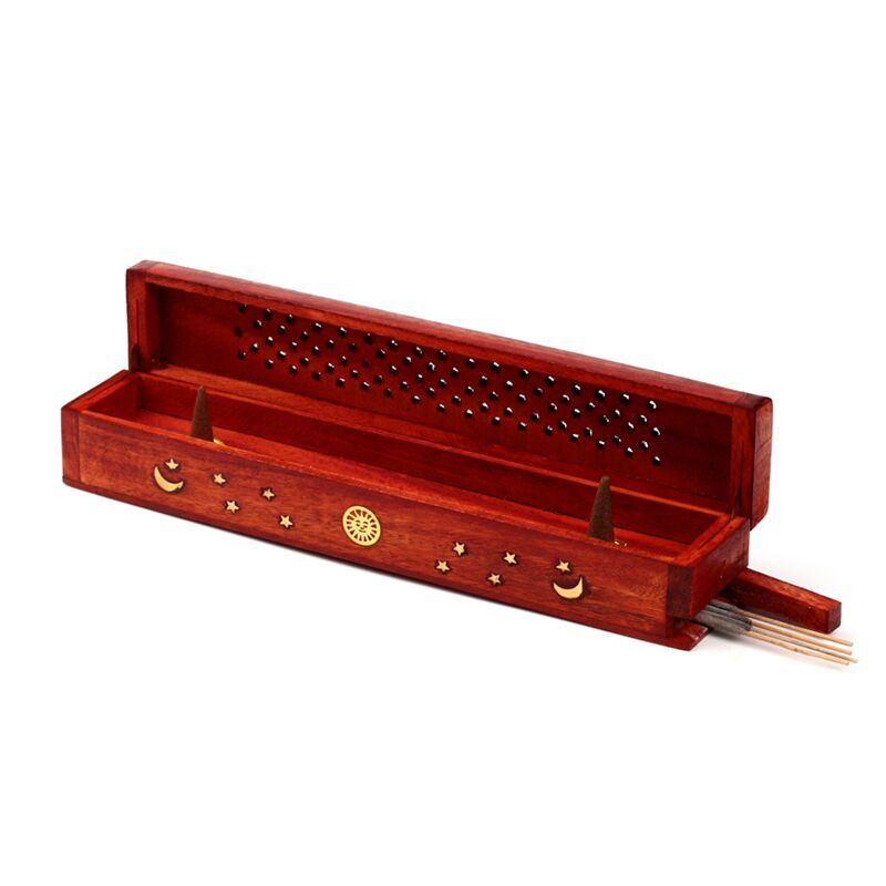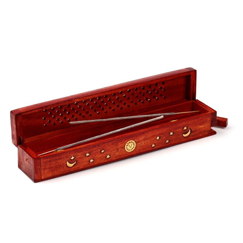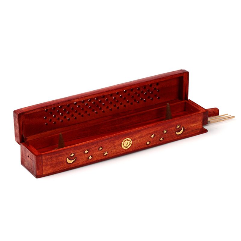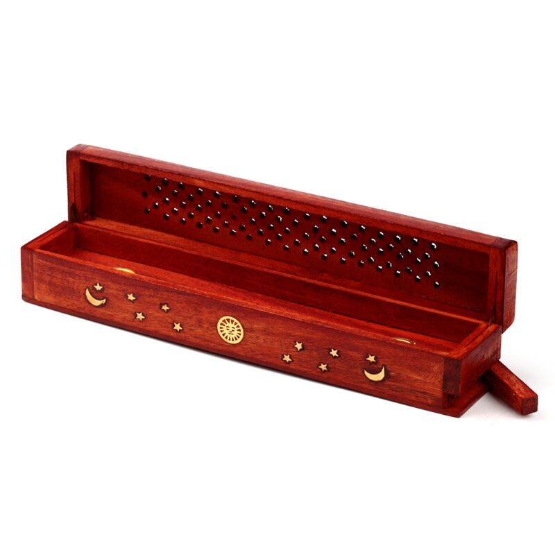 Mango Wood Ashcatcher Incense Burner Box Sun, Moon & Stars